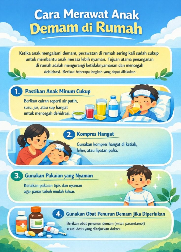 Ketika anak mengalami demam, perawatan di rumah sering kali sudah cukup untuk membantu anak merasa lebih nyaman. Tujuan utama penanganan di rumah adalah mengurangi ketidaknyamanan dan mencegah dehidrasi. Berikut beberapa langkah yang dapat dilakukan.