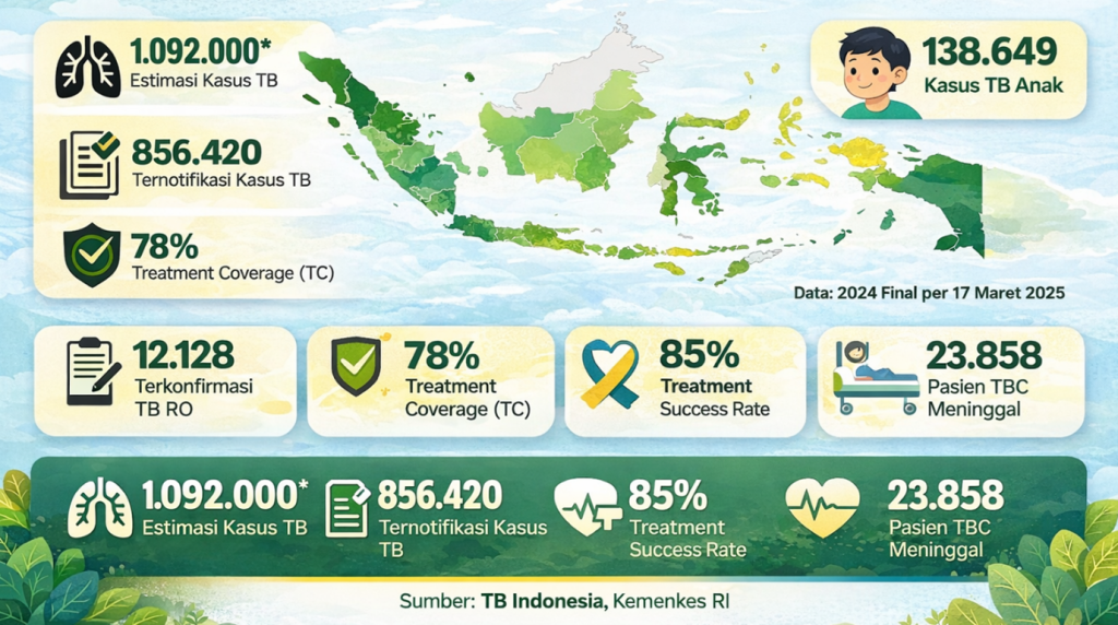 TB masih menjadi masalah kesehatan yang cukup besar di dunia, termasuk di Indonesia. Penyakit ini tidak hanya menyerang orang dewasa, tetapi juga dapat terjadi pada anak-anak. Setiap tanggal 24 Maret diperingati sebagai Hari Tuberkulosis Sedunia (World TB Day). Peringatan ini bertujuan meningkatkan kesadaran masyarakat mengenai TB, pentingnya deteksi dini, serta pengobatan yang tepat hingga tuntas. Secara global, TB masih menjadi salah satu penyakit infeksi paling mematikan. Laporan kesehatan dunia menunjukkan bahwa TB menyebabkan sekitar 1,23 juta kematian di seluruh dunia pada tahun 2024. Angka ini menunjukkan bahwa TB masih menjadi ancaman kesehatan masyarakat yang serius.